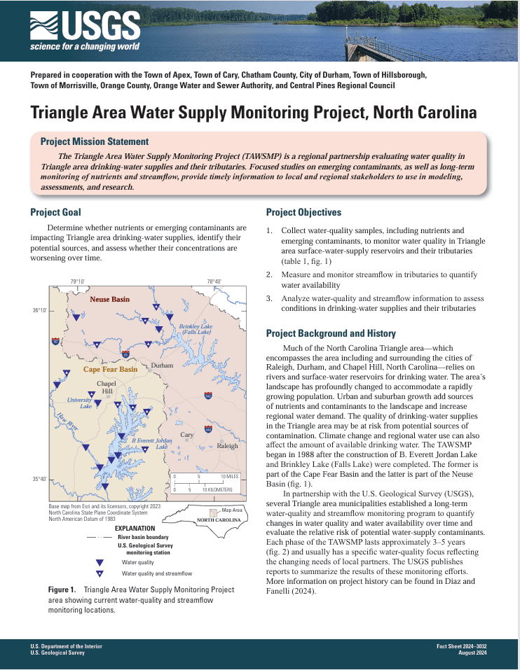 The Triangle Area Water Supply Monitoring Project (TAWSMP) is a collaborative partnership between local governments to monitor drinking water supplies in the region through joint efforts. The Project is enabled through a series of Interlocal Agreements among all of the local government Partners, agreements between the Partners and Central Pines Regional Council (CPRC), and Joint Funding Agreements between the Partners and United States Geological Survey (USGS). The TAWSMP local government partners share the cost of the program with the USGS. A Steering Committee comprised of one representative from each Partner reviews and adjusts these agreements to accommodate community needs before each new Phase. Through this work, the TAWSMP has conducted water quality and stream gauge analyses for the last 30 years, and has compiled one of the most robust continuous water supply monitoring datasets in the nation.